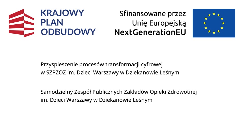 Samodzielny Zespół Publicznych Zakładów Opieki Zdrowotnej im. Dzieci Warszawy w Dziekanowie Leśnym podpisał umowę na realizację projektu „Przyspieszenie procesów transformacji cyfrowej w SZPZOZ im. Dzieci Warszawy w Dziekanowie Leśnym”, dofinansowaną ze środków Krajowego Planu Odbudowy i Zwiększania Odporności (KPO), w ramach Inwestycji D1.1.2 „Przyspieszenie procesów transformacji cyfrowej ochrony zdrowia poprzez dalszy rozwój usług cyfrowych w ochronie zdrowia” będącej elementem komponentu D „Efektywność, dostępność i jakość systemu ochrony zdrowia”.