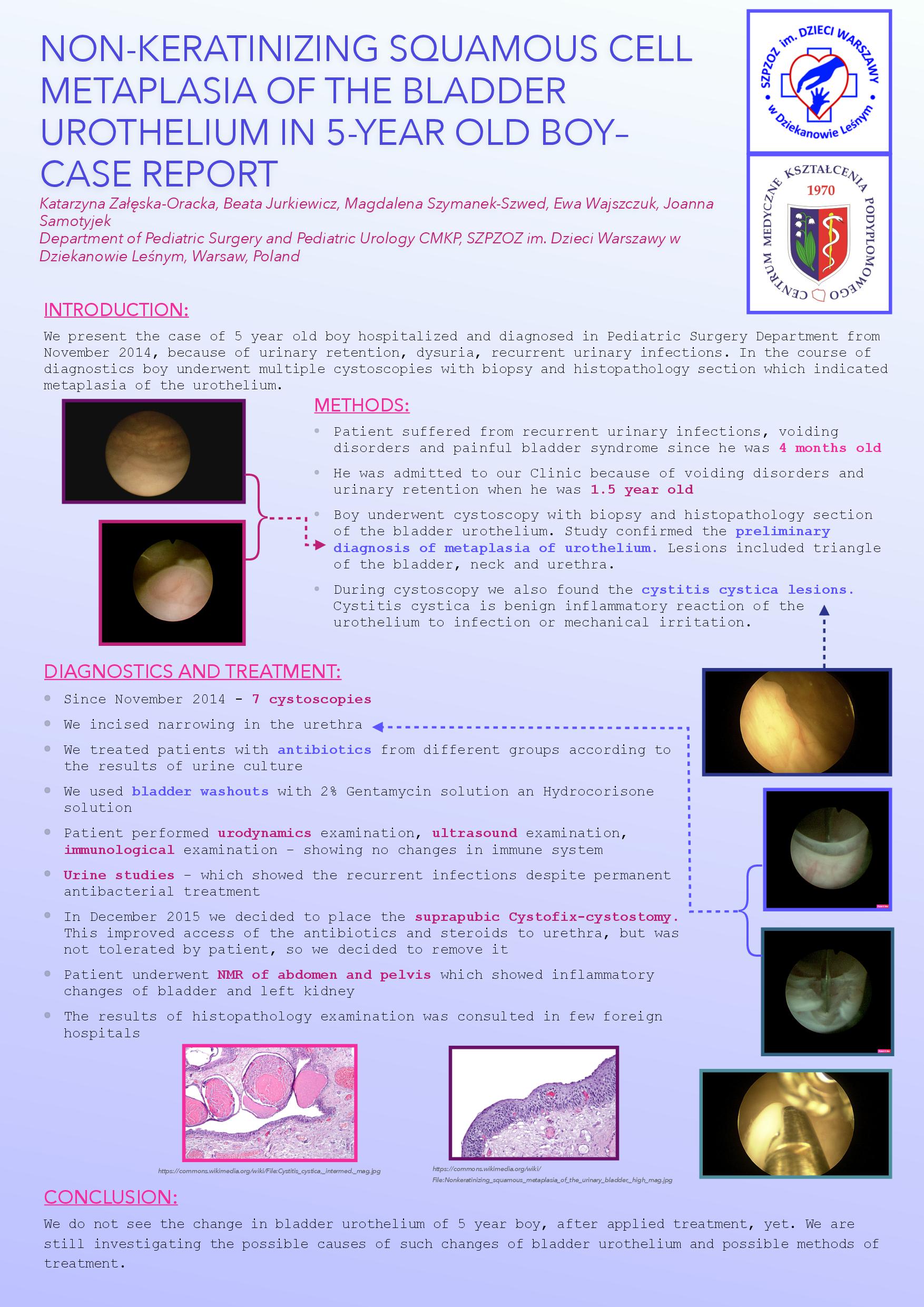 W pierwszej z nich, „ Cystitis cystica u dzieci” analizowano wyniki leczenia pacjentów z przewlekłym zapaleniem błony śluzowej pęcherza moczowego leczonych w Oddziale Chirurgii w okresie od stycznia 2016 do kwietnia 2019 roku.